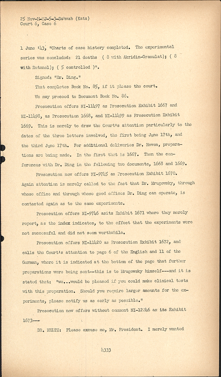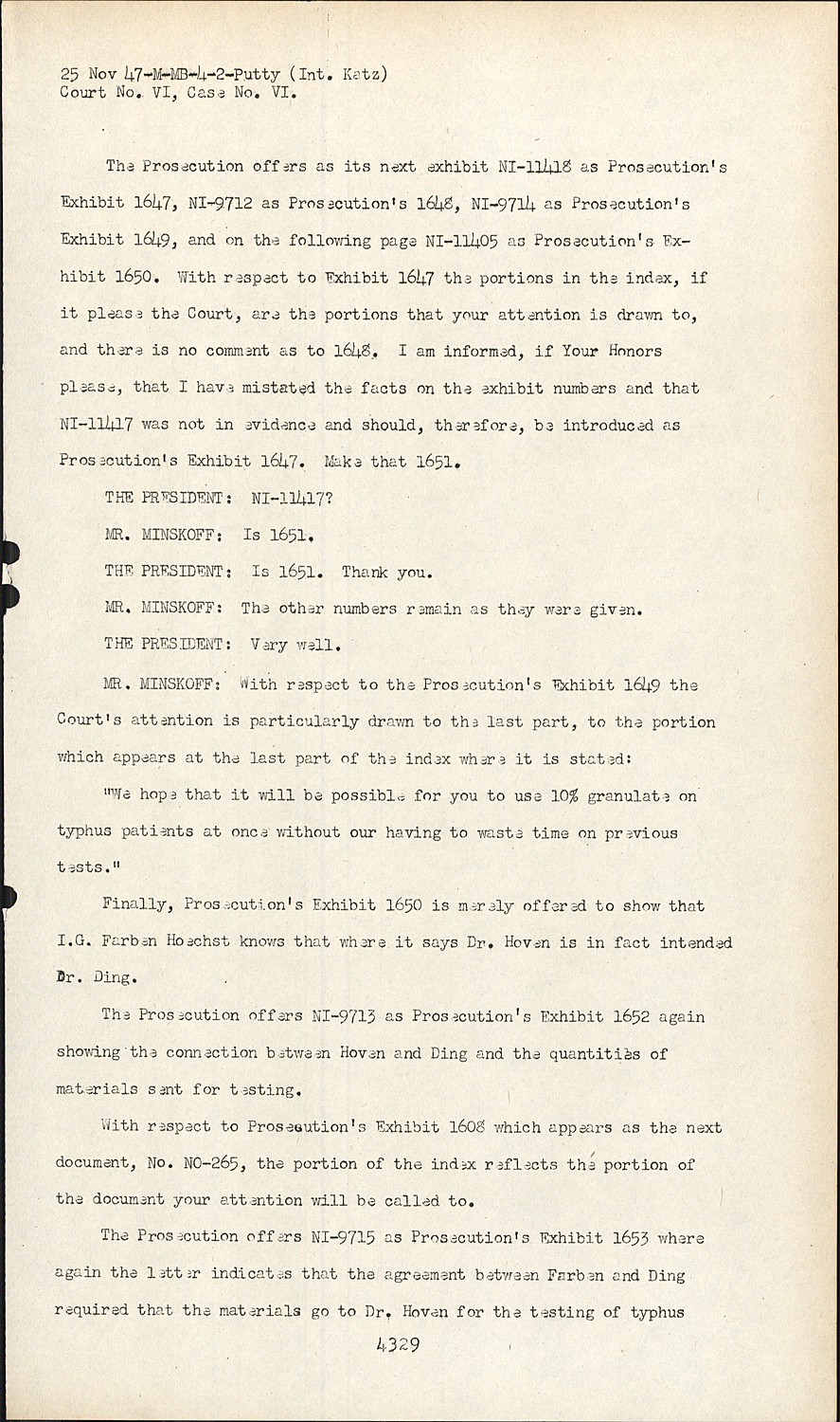 The Prosecution offers NI-9715 as Prosecution's Exhibit 1653 where again the letter indicates that the agreement between Farben and Ding required that the materials go to Dr. Hoven for the testing of typhus Court No. VI, Case No. VI.
