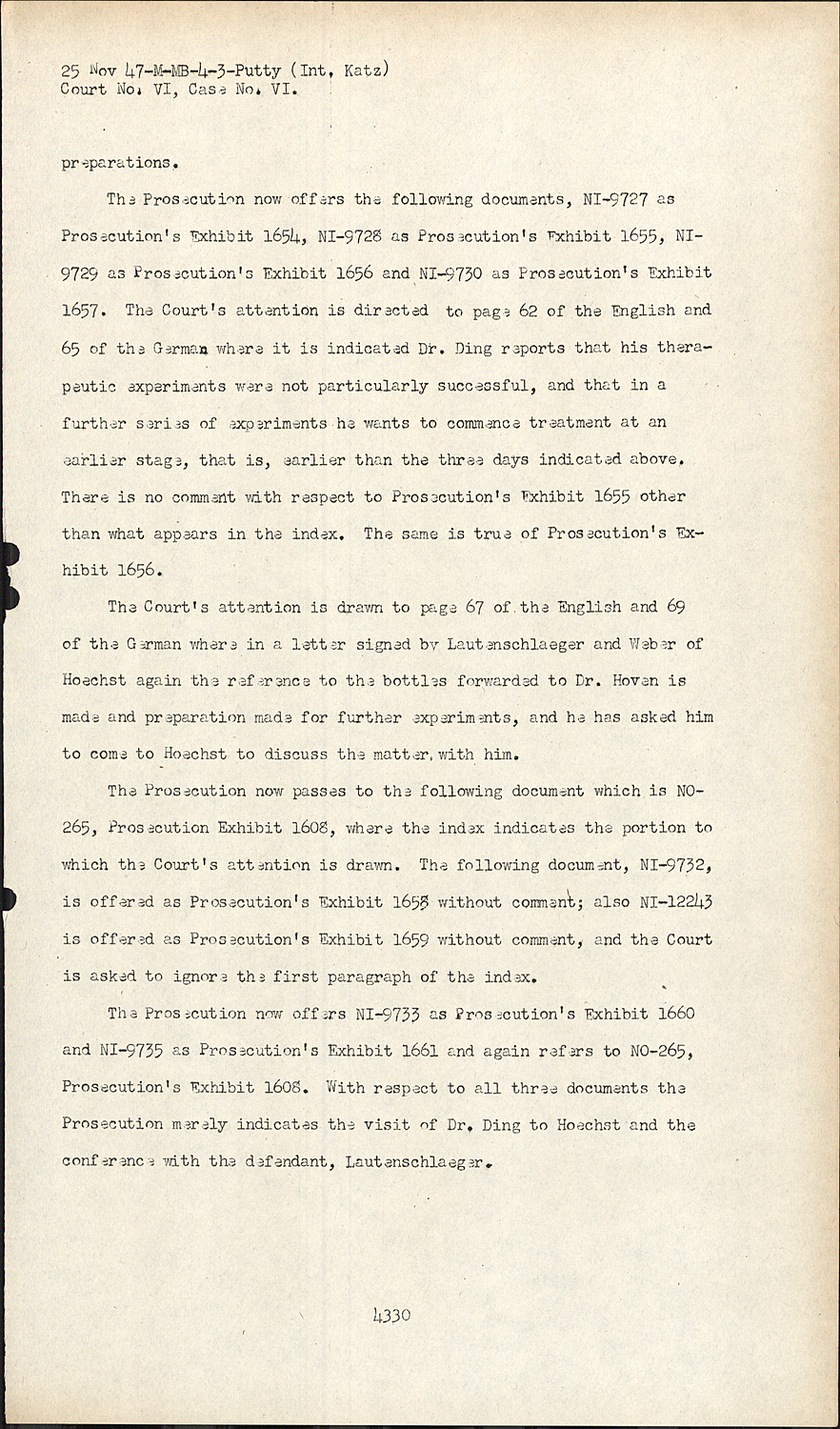 The Prosecution now offers the following documents, NI-9727 as Prosecution's Exhibit 1654, NI-9728 as Prosecution's Exhibit 1655, NI9729 Prosecution's Exhibit 1656 and NI-9730 as Prosecution's Exhibit 1657. The Court's attention is directed to page 62 of the English and 65 of the German where it is indicated Dr. Ding reports that his therapeutic experiments were not particularly successful, and that in a further series of experiments he wants to commence treatment at an earlier stage, that is, earlier than the three days indicated above. There is no comment with respect to Prosecution's Exhibit 1655 other than what appears in the index. The same is true of Prosecution's Exhibit 1656.