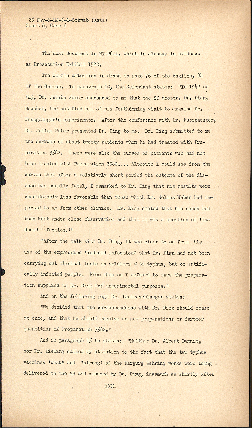 The Courts attention is drawn to page 76 of the English, 84 of the German. In paragraph 10, the defendant states: "In 1942 or '43, Dr. Julius Weber announced to me that the SS doctor, Dr. Ding, Hoechst, had notified him of his forthcoming visit to examine Dr. Fussgaenger's experiments. After the conference with Dr. Fussgaenger, Dr. Julius Weber presented Dr. Ding to me. Dr. Ding submitted to me the cur*ves of about twenty patients whom he had treated with Preparation 3582. There were also the curves of patients who had not been treated with Preparation 3582.... Althouth I could see from the curves that after a relatively short period the outcome of the disease was usually fatal, I remarked to Dr. Ding that his results were considerably less favorable than those which Dr. Jelius Weber had reported to me from other clinics. Dr. Ding stated that his cases had been kept under close observation and that it was a question of 'induced infection.'" "After the talk with Dr. Ding, it was clear to me from his use of the expression 'induced infection' that Dr. Dign had not been carrying out clinical tests on soldiers with typhus, but on artifically infected people.